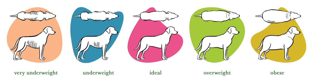 Once your dog is settled on to a food, keep an eye on his weight as this is the easiest way of telling whether or not the feeding amounts are correct. Compare your dog's body shape to the dogs pictured below. Your dog is at his ideal weight when you can feel, but not easily see, the last two or three ribs and when there is an easily identifiable waist line when looking down from above.